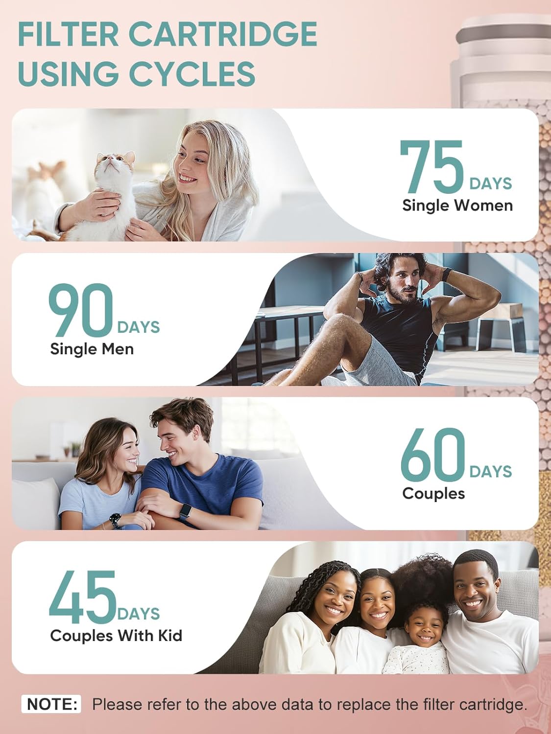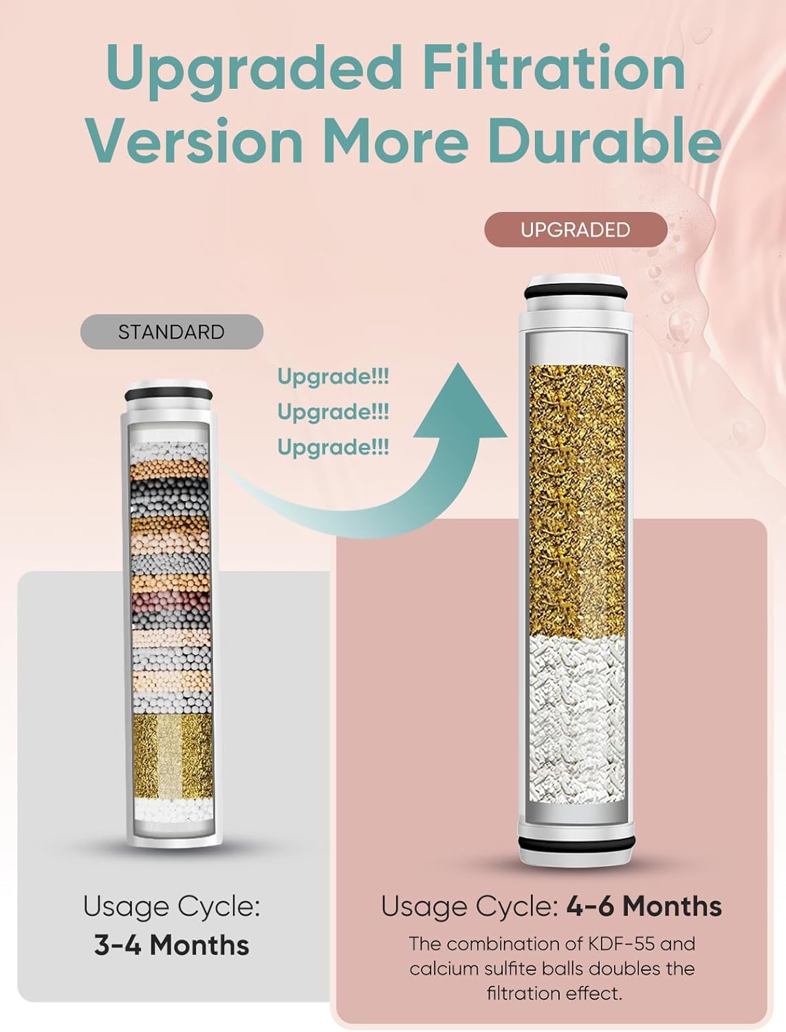 Standard: Features a 20-layer filtration system that effectively removes chlorine and heavy metals from water. Recommended replacement cycle: 3-4 months (the specific lifespan depends on the water quality in your area).