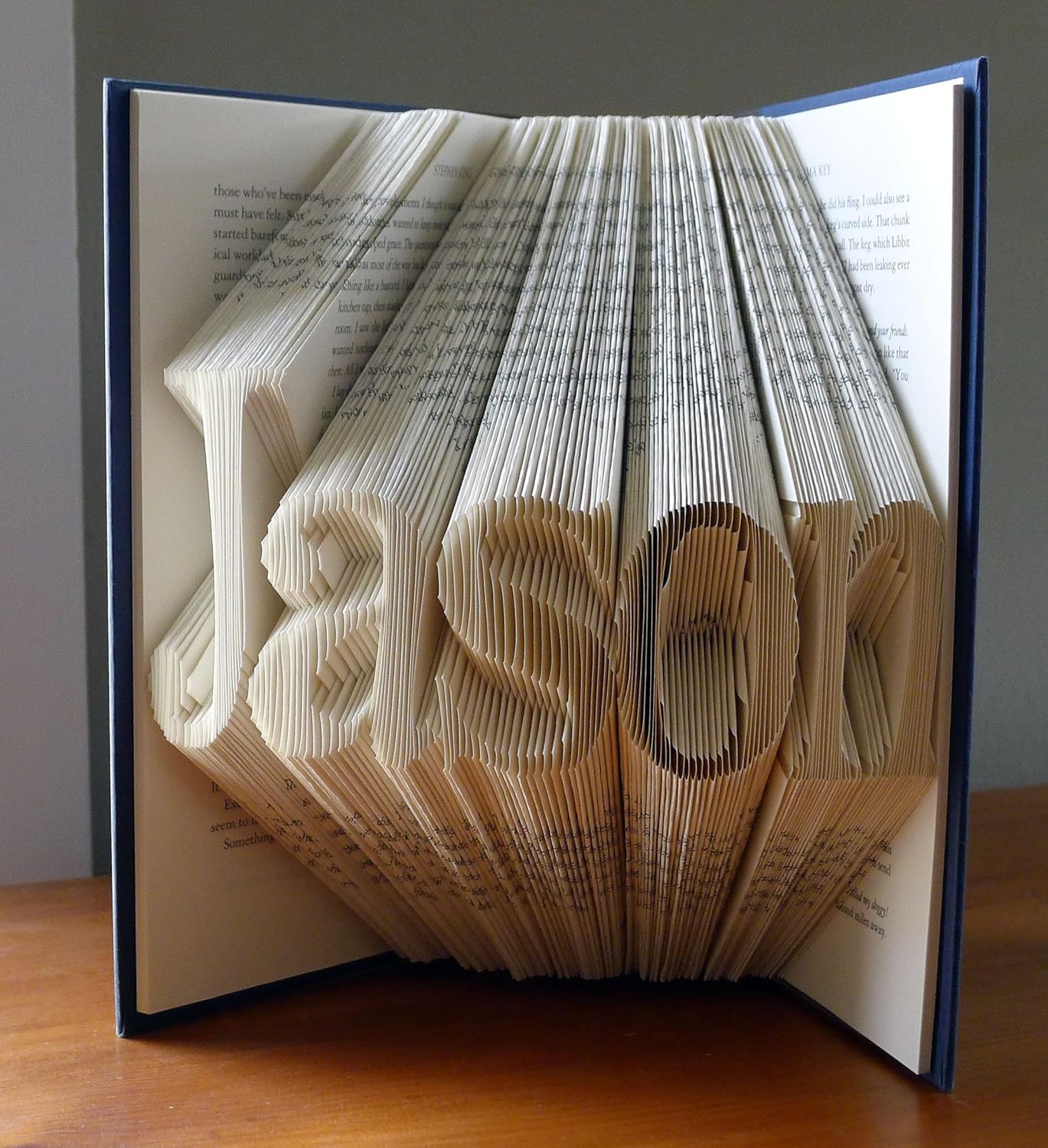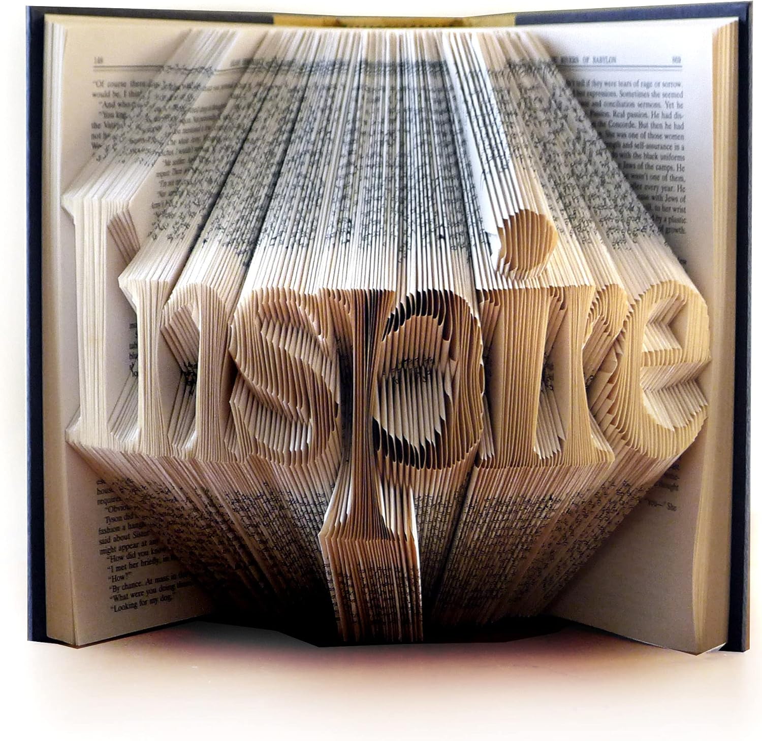This unique custom book is made by carefully folding the individual pages of a book to spell any word of your choice . Please get in touch with me if you would like a book with more than 7 letters and I can work with you on a special order. You can select the word of your choice… Pick your first name, last name, your favorite word, anything is possible! These books are made using the Times font. The Helvetica font is also available. Other fonts can be used at an additional cost. Made from recycled books, each book can also be crafted to your specification. Give this inspirational gift as a present, or treat yourself!