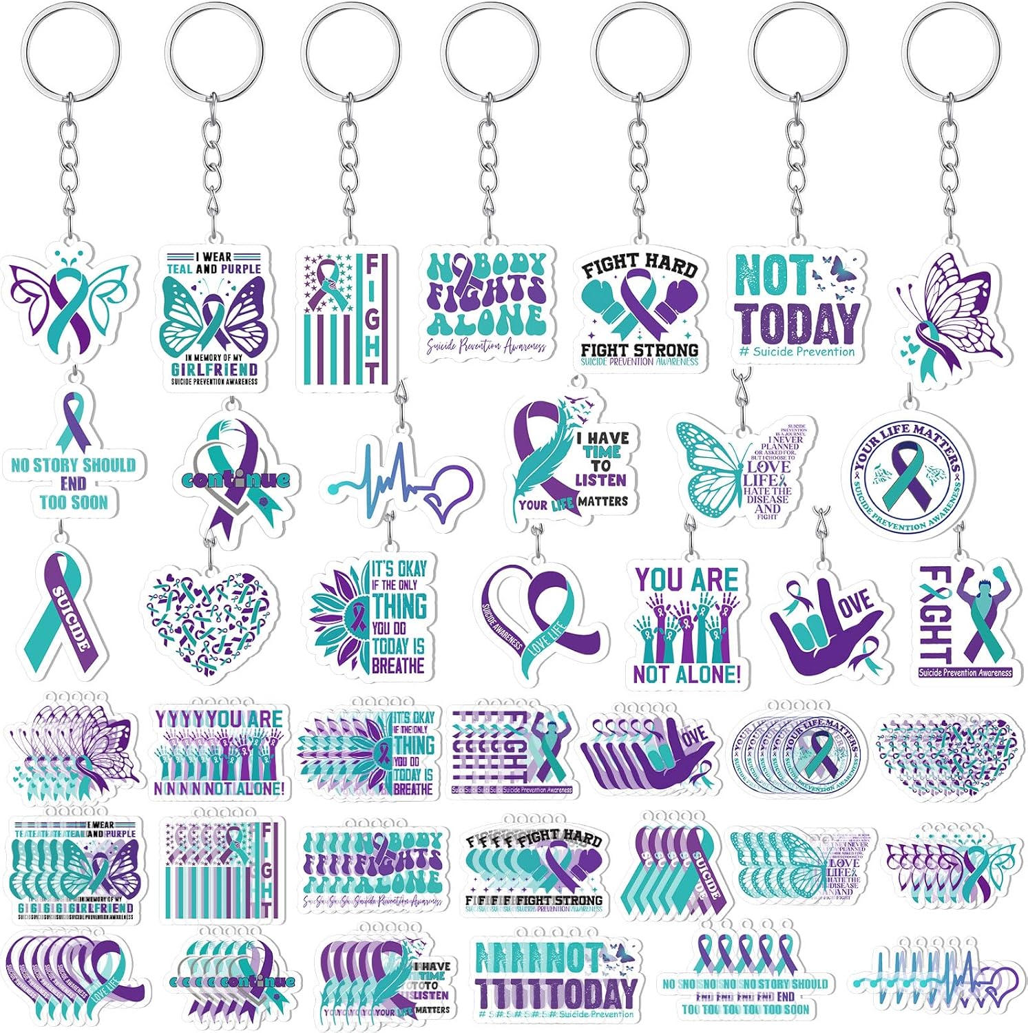 Henoyso 100 Pcs Suicide Prevention Awareness Keychain Items Bulk Acrylic Teal Purple Ribbons Keychains for Charity Campaign